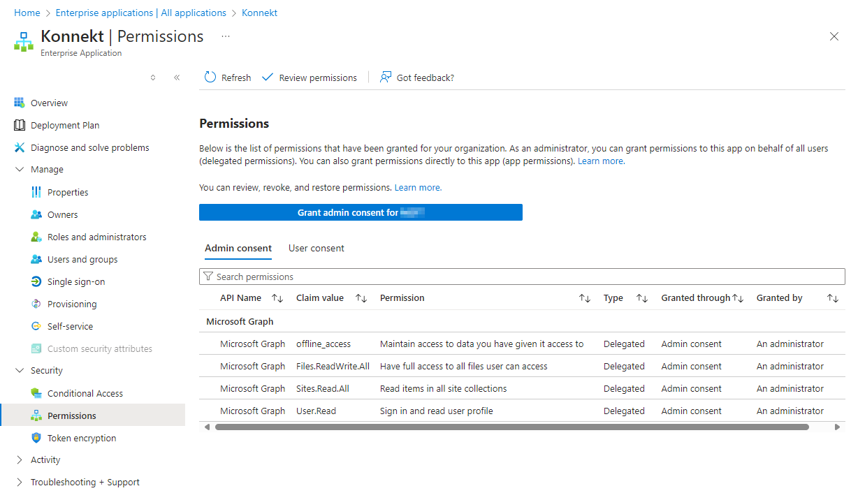 [Since some of the permissions require to be consented by an admin](https://learn.microsoft.com/en-us/graph/permissions-reference), you have to do the admin consent before using KONNEKT with regular users.