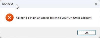 When trying to log in to KONNEKT, the error message "Failed to obtain an access token to your OneDrive account" appears.